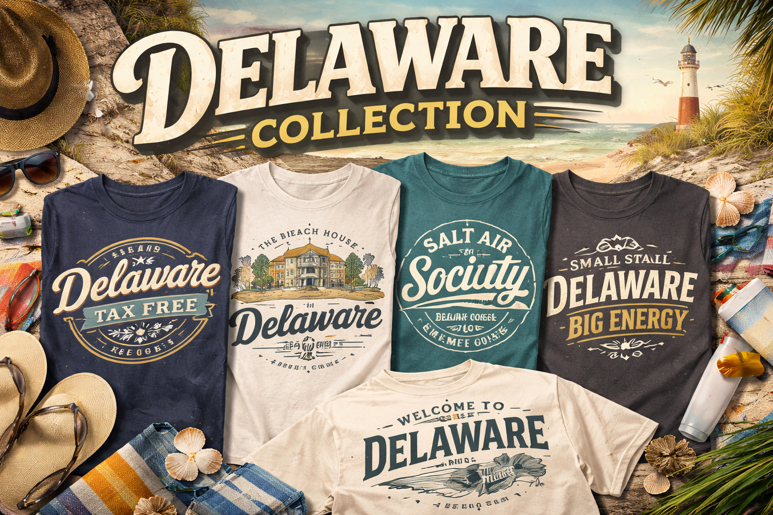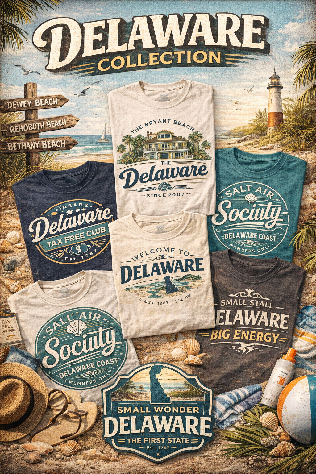 The Delaware Collection blends coastal lifestyle, local humor, and vintage badge design into a lineup of highly wearable graphic apparel. Inspired by Rehoboth Beach, tax-free shopping, and First State pride, each design captures the laid-back charm and unique personality of Delaware. From beach house vibes to tongue-in-cheek slogans, this collection turns small-state energy into standout style.