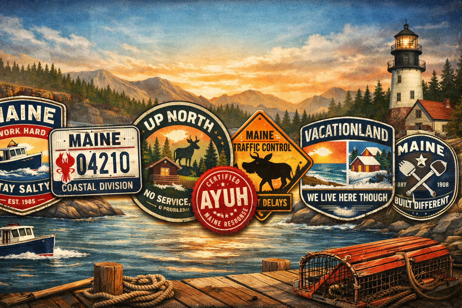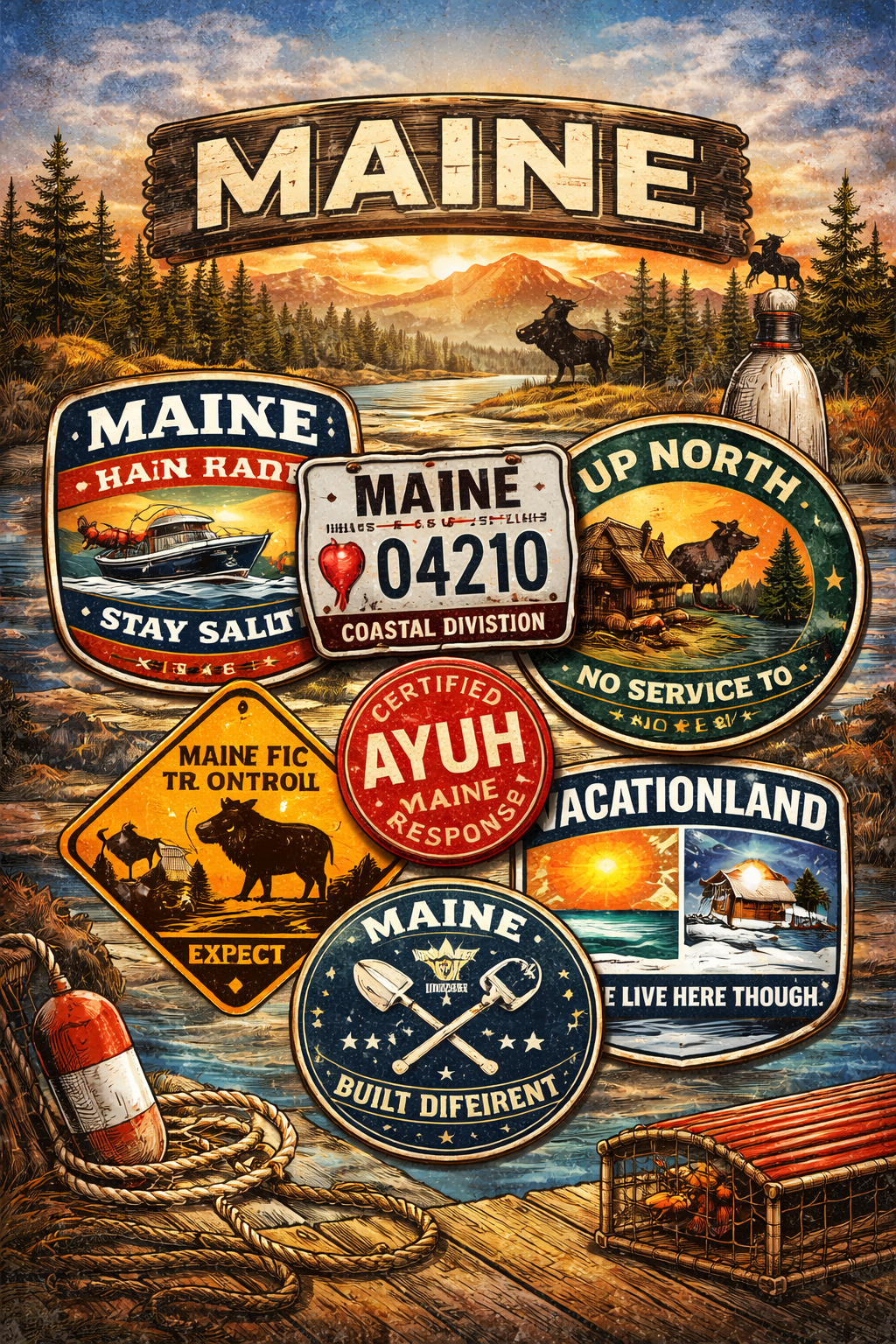Capture the spirit of Maine with this bold, vintage-inspired apparel collection featuring lobster life, moose crossings, lighthouse heritage, and Up North cabin culture. Designed in a rugged badge style, each piece blends coastal lifestyle, outdoor adventure, and New England humor into timeless graphics that feel right at home from the shoreline to the woods.