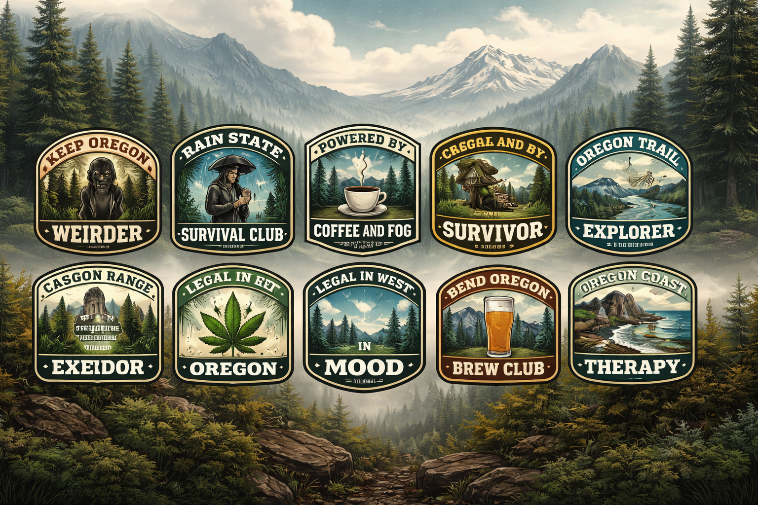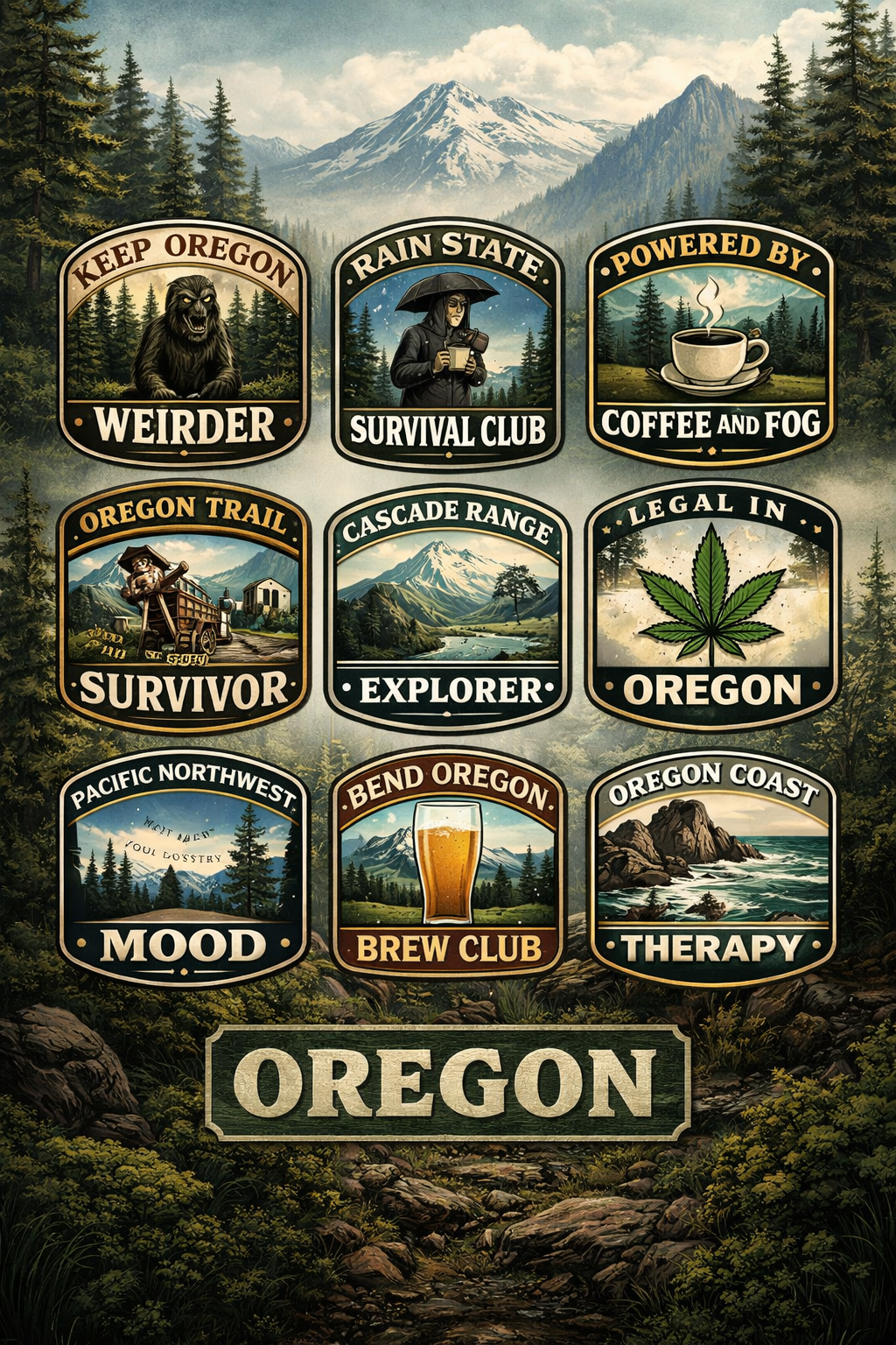 The Oregon Badge Collection blends Pacific Northwest lifestyle, outdoor adventure, and subtle humor into a series of bold, badge-style t-shirt designs. Inspired by iconic elements like the Cascade Mountains, Oregon Coast, craft beer culture, and endless rain, each design captures the spirit of Oregon in a clean, wearable format. From vintage trail nostalgia to modern coffee-fueled living, this collection speaks to locals, travelers, and outdoor enthusiasts alike.