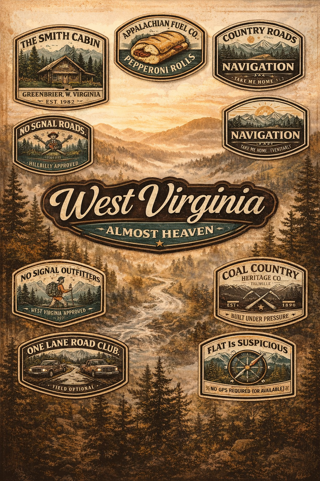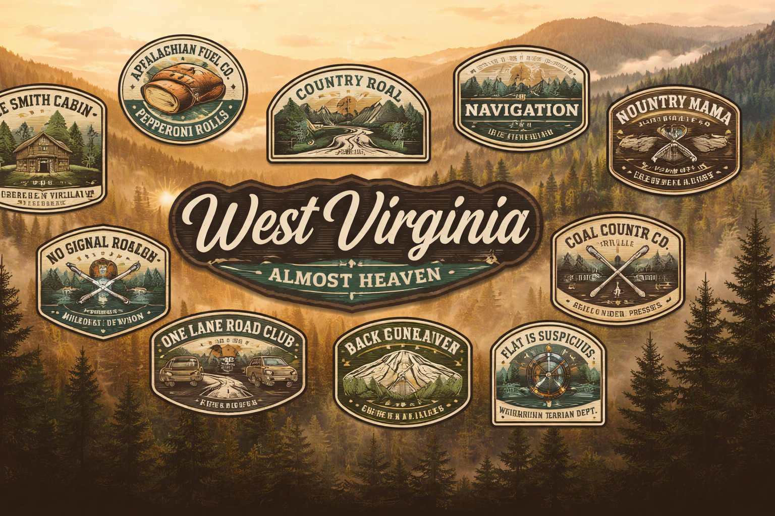 Explore the West Virginia Collection, a vintage-inspired lineup of funny Appalachian t-shirts featuring mountain life, country roads, pepperoni rolls, and backroad culture. Designed in a classic badge style, each piece blends humor, heritage, and rugged outdoor lifestyle into wearable designs perfect for locals and visitors alike.